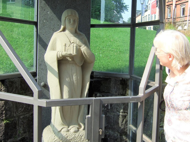 Frisch restauriert präsentiert sich am Eingang zum Rosengarten an der Genovevaburg die Skulptur St. Hubertus. Die Skulptur ist ein Werk des Künstlers Professor Carl Burger, der von 1922 bis 1937 Direktor der Steinmetzfachschule in Mayen war. Restauriert wurde die Skulptur von Bildhauer Ralf Bell-Schäfgen.
